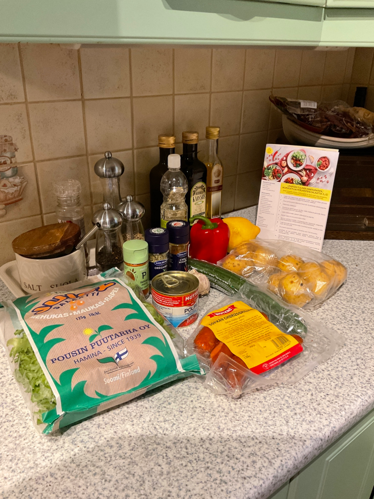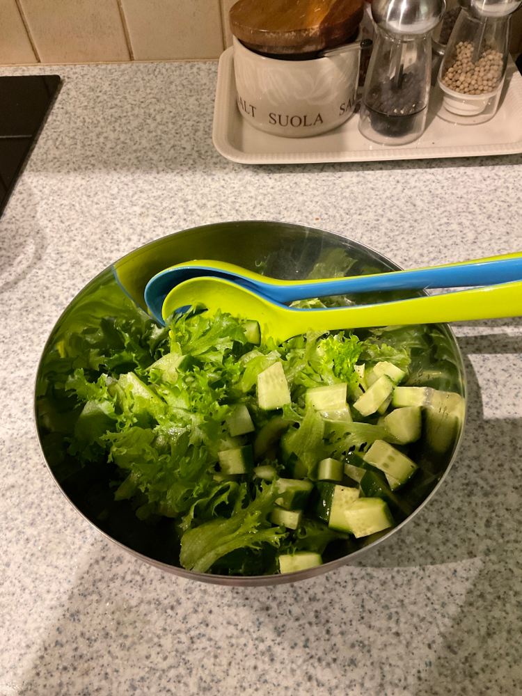 Revi salaatti, lisää kurkkukuutiot. Hieman öljyä, valkoviinietikkaa ja mustapippuria.