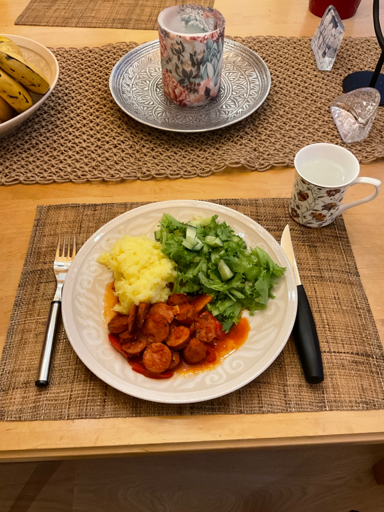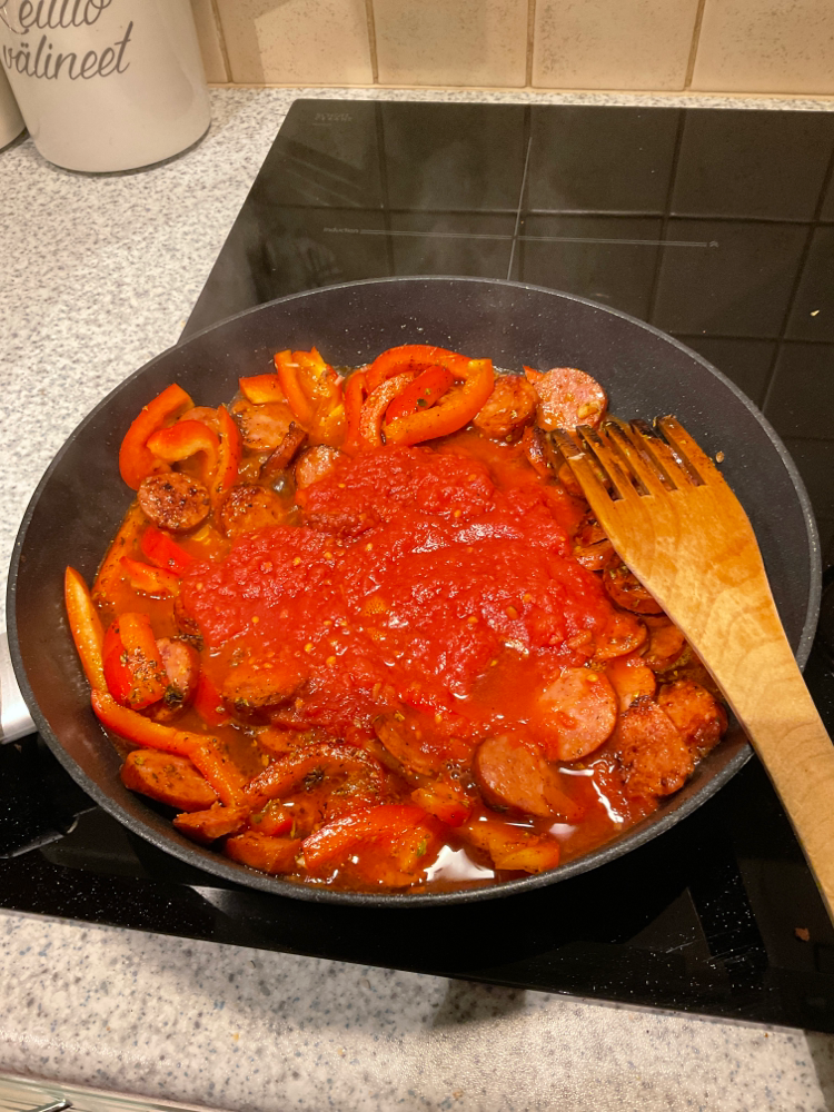 Paista makkaroita pannulla muutama minuutti. Lisää 2 valkosipulinkynttä ja yhden paprikan paprikasuikaleet. Paista vähän aikaa ja lisää loput mausteet 0,5-1tl (suola, mustapippuri, oregano, paprikajauhe,chilijauhe), 1 rkl valkoviinietikka ja 1 pieni tölkki tomaattimurska + huuhtele purkki n. dl vettä. Hauduta n. 5 min.