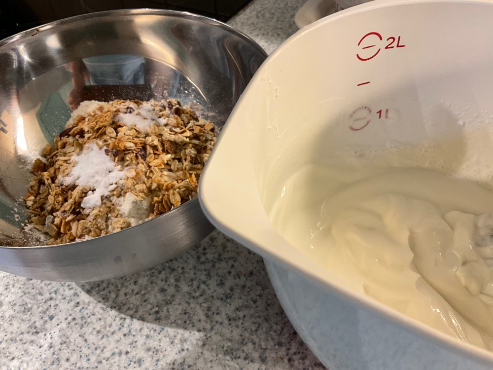 Sekoita 250 g maitorahkaa, 0,5 dl maitoa ja 2 rkl siirappia. Lisää joukkoon ja sekoita kuivat aineet: 2 dl mysliä, 2,5 dl vehnäjauhoja, 1 tl soodaa ja 1 tl suolaa. Vehnäjauhojen sijasta voi käyttää
