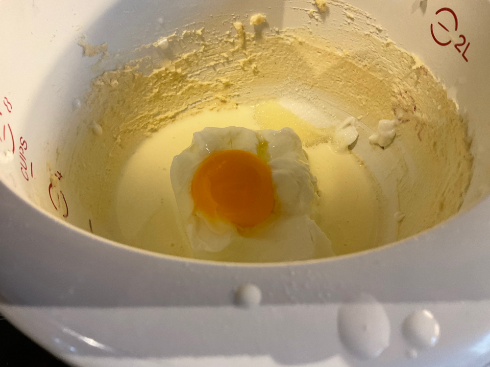 Sekoita täytteen ainekset: 250 g maitorahkaa, 1 dl kuohukermaa, 1 muna ja 0,5 dl sokeria.