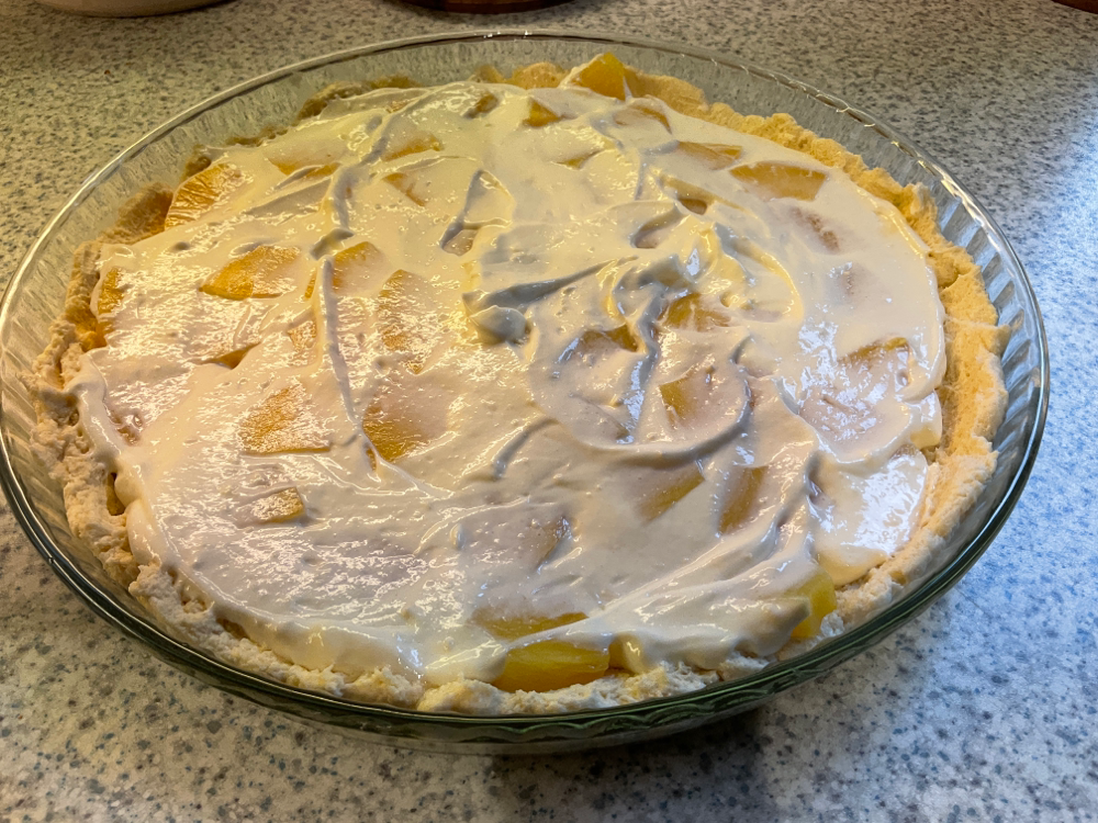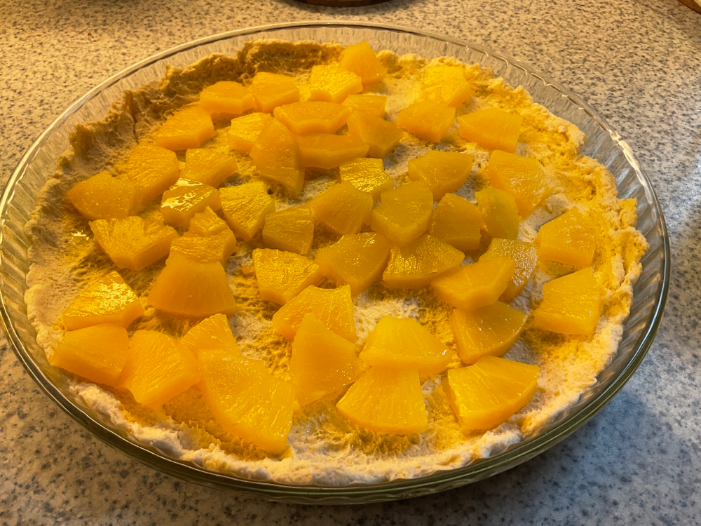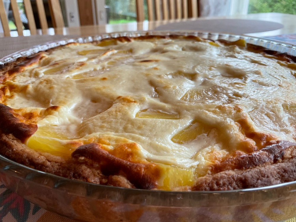 Taputtele taikina ison piirakkavuoan pohjalle. Paloittele 8 ananasviipaletta ja lisää ne pohjan päälle.