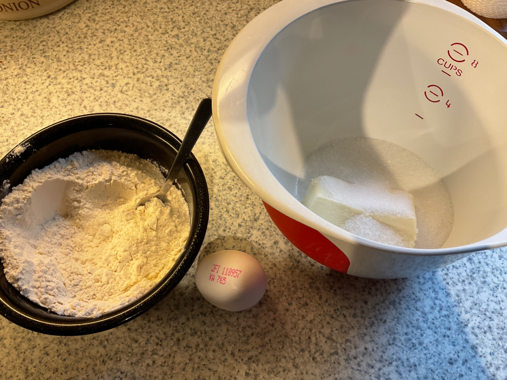 Vaahdota pehmeä margariini 150 g ja 1 dl sokeria.Lisää 1 muna voimakkaasti sekoittaen. Sekoita joukkoon 3 dl vehnäjauhoja ja 1 tl leivinjauhetta.