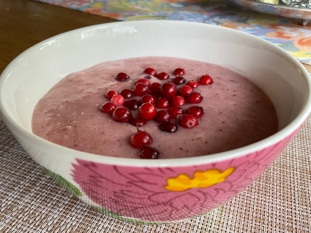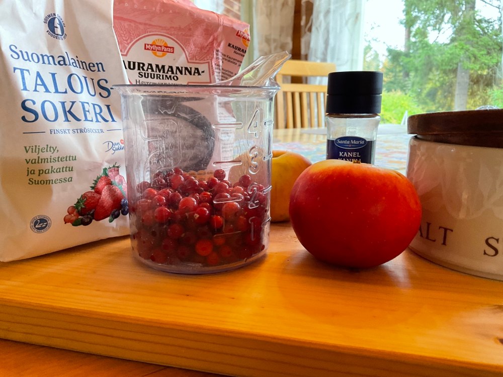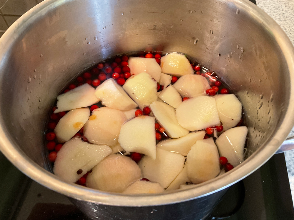 Keitä 2 dl puolukoita ja 3 kpl kuorittuja ja paloiteltuja omenoita 1 litraa vettä.