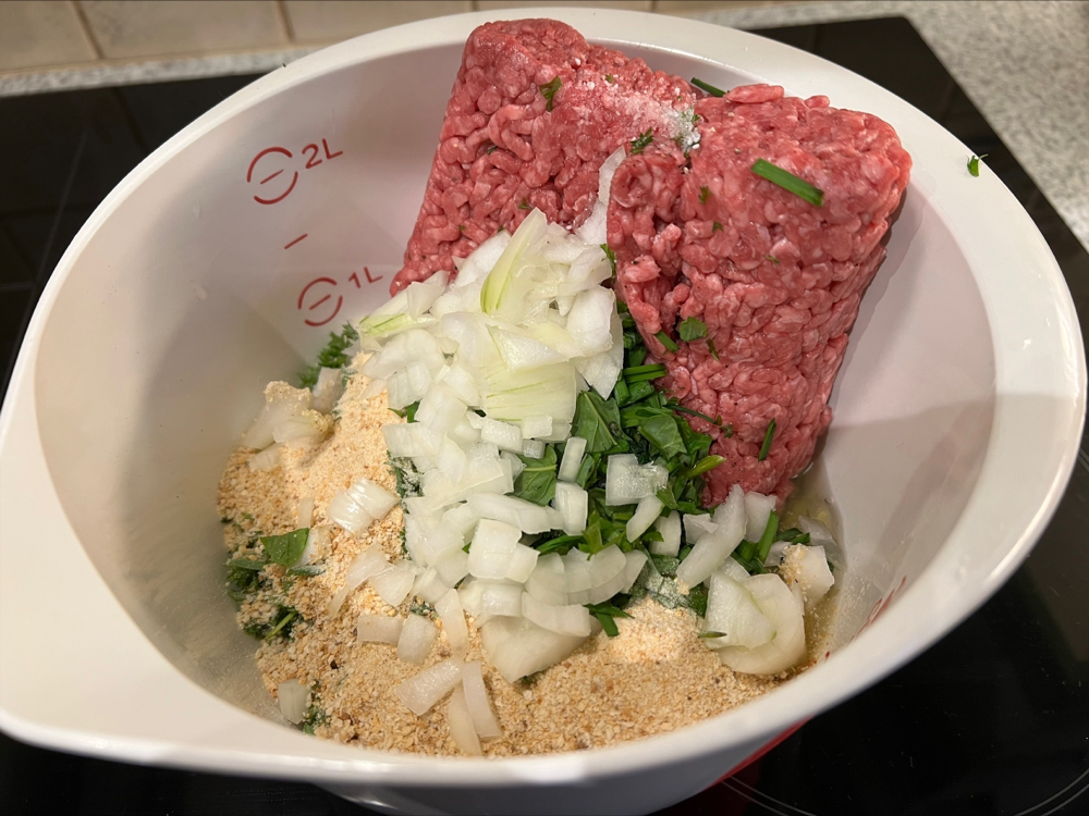 700 g nautajauhelihaa, 1 silputtu sipuli, 2 kananmunaa, 2 rkl silputtua tuoretta persiljaa, 5 rkl korppujauhoja, 1 tl rouhittua mustapippuria ja valkopippuria, reilu tl suolaa ja loraus soijaa. Lisäksi silppusin mukaan hieman tuoretta minttua ja valkoruohosipulia.