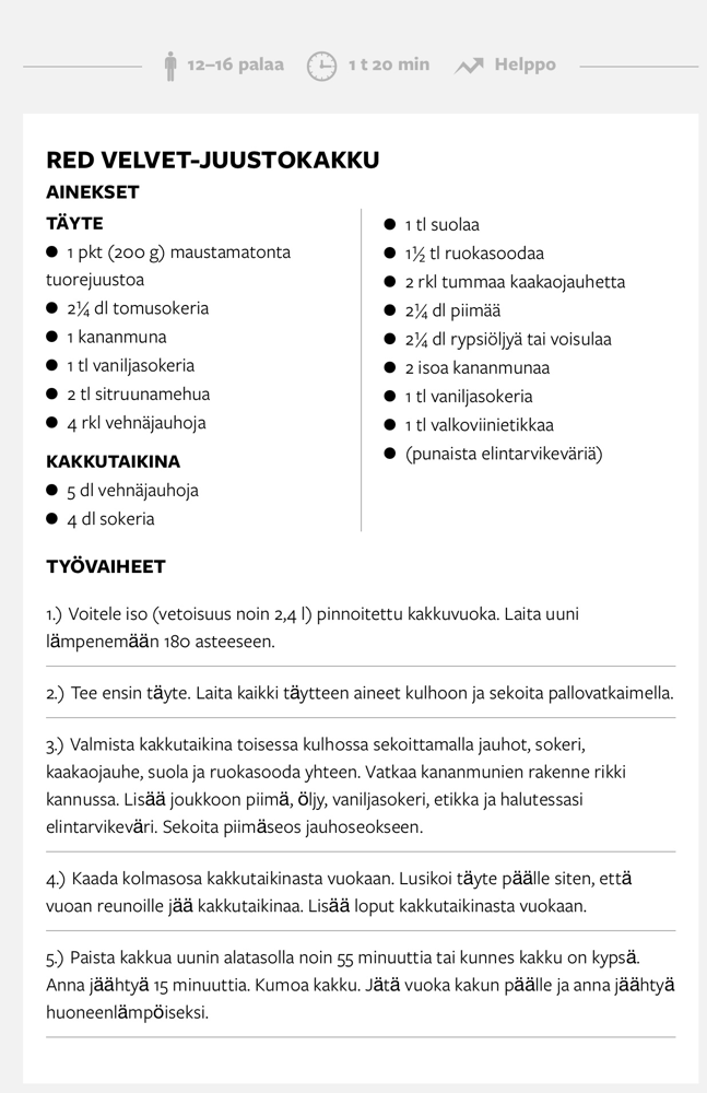 Jälkiruoat · 23. December 2022 Red velvet-juustokakku Tässä hyvä vaihtoehto taatelikakulle. Tykkäsin! tagPlaceholderTags: Tuorejuusto, kaakoa, red, velvet Write a comment Comments: 0