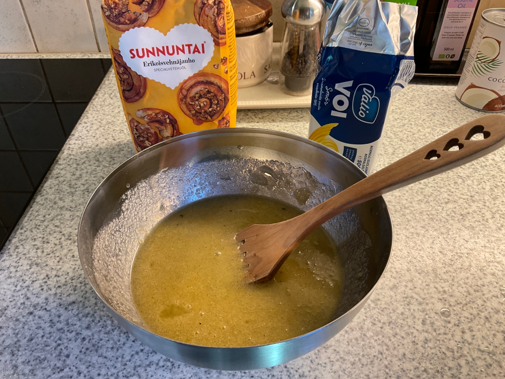Lisää 150 g sulatettua voita ja 2,5 dl vehnäjauhoja.