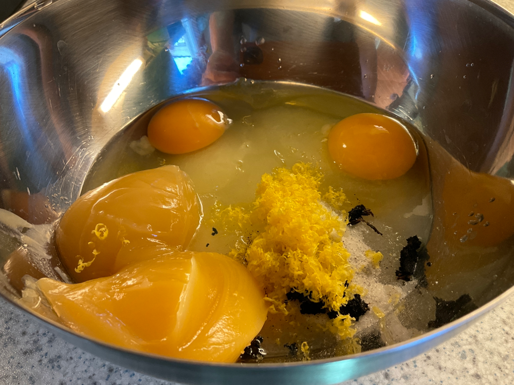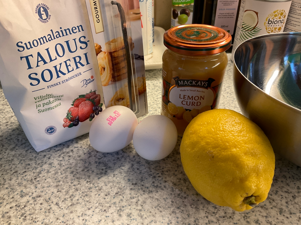 2,5 dl sokeria, 1 tl vaniljasokeria, 2 kananmunaa, 1 tl vanilja-aromia, 2 rkl sitruunan mehua, 2 rkl lemon curdia ja 1 sitruunan kuori.
