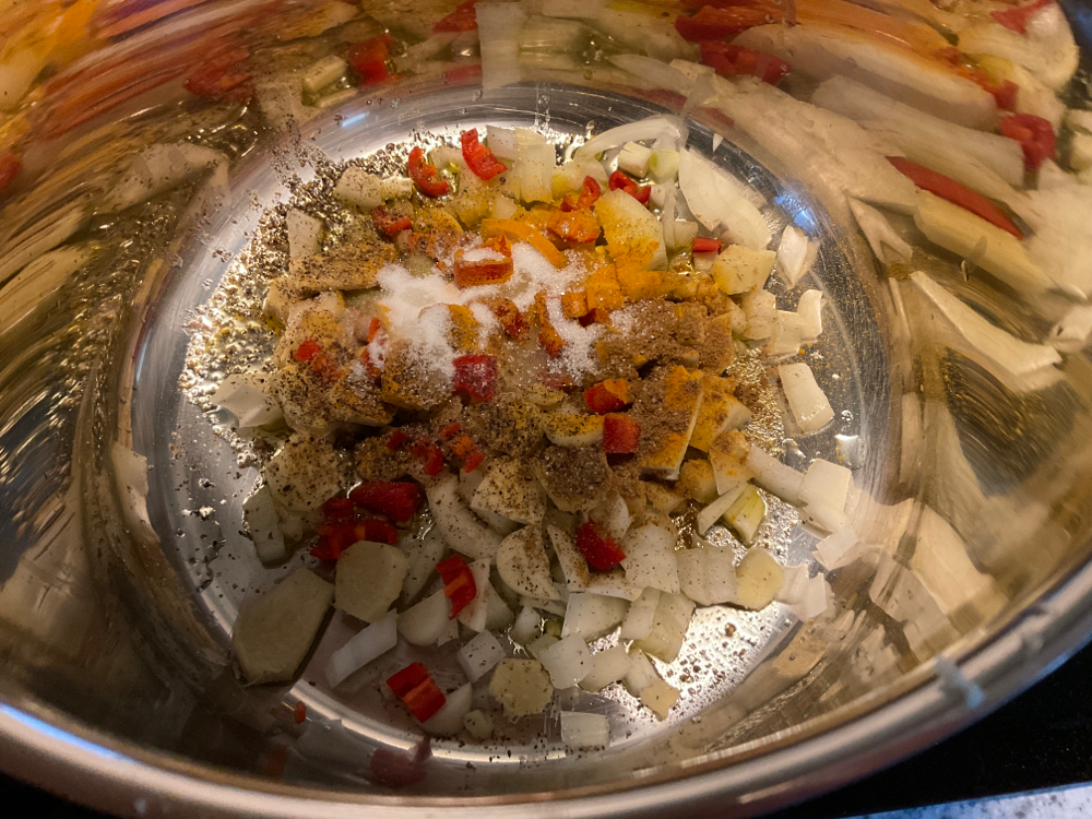 Mausteina: 2 tl juustokuminaa, 2 tl kurkumaa, 2 tl sokeria, 1 tl suolaa, 1 rkl valkoviinietikkaa, 2 tl mustapippuria.