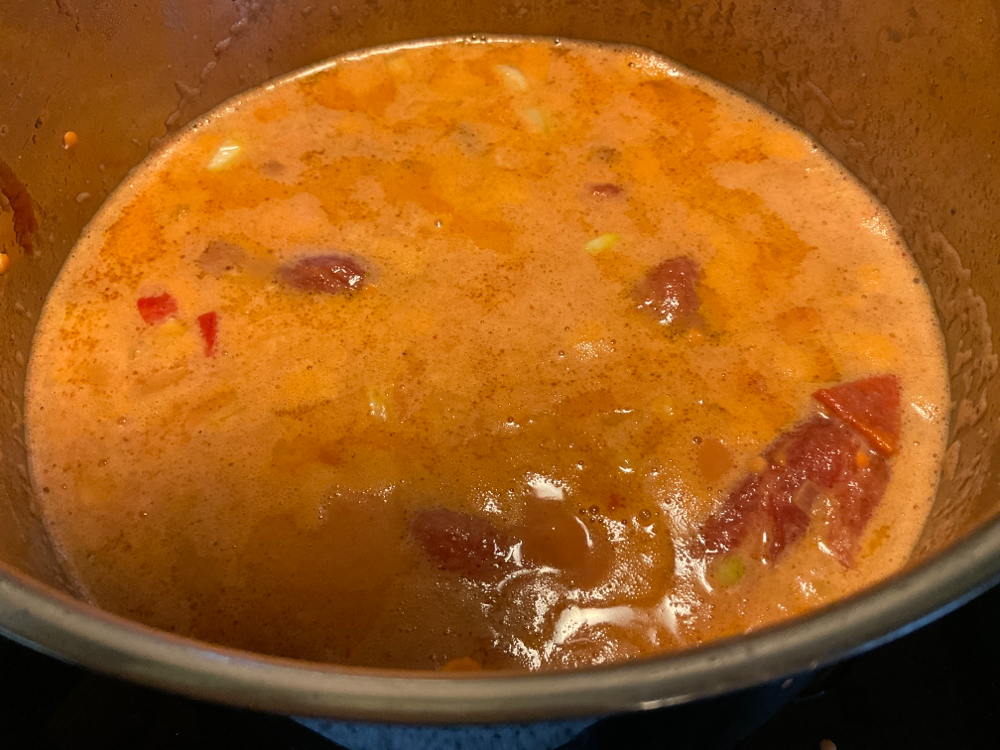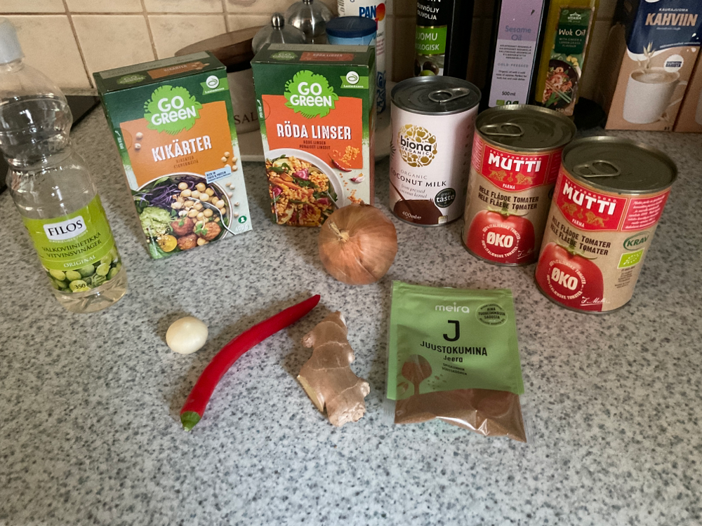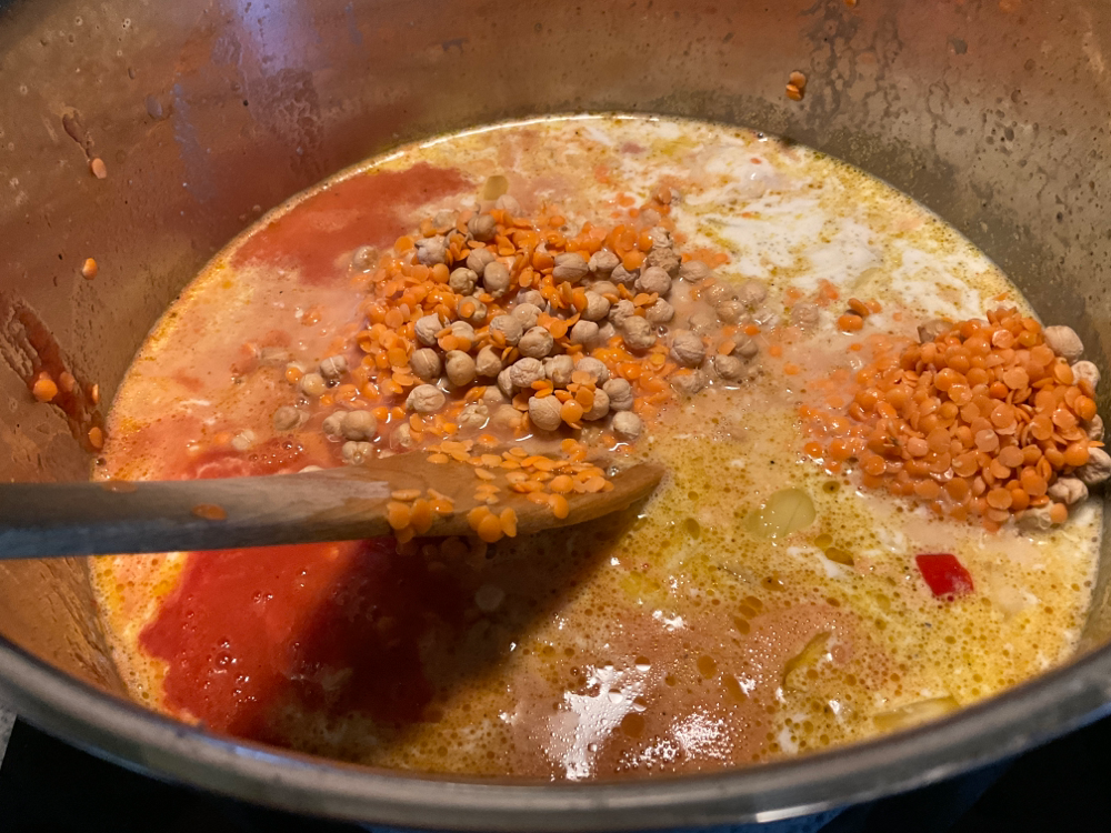 Lisää kattilaan linssit, kikherneet, 1 tlk (400ml) kookosmaitoa ja 2 tlk (400g) kuorittuja tomaatteja tomaattimehussa. Huuhdo purkit vedellä ja lisää neste kattilaan n. 3-4 dl.