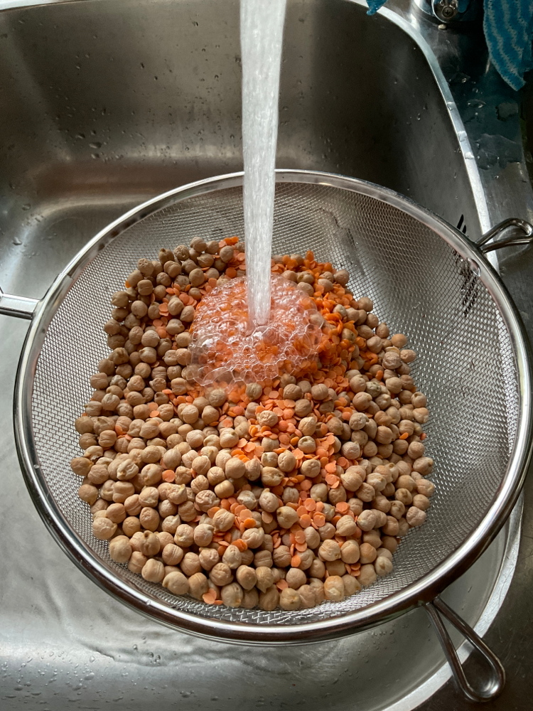 Huuhdo kylmällä vedellä 3 dl punaisia linssejä ja 380 g kikherneitä.