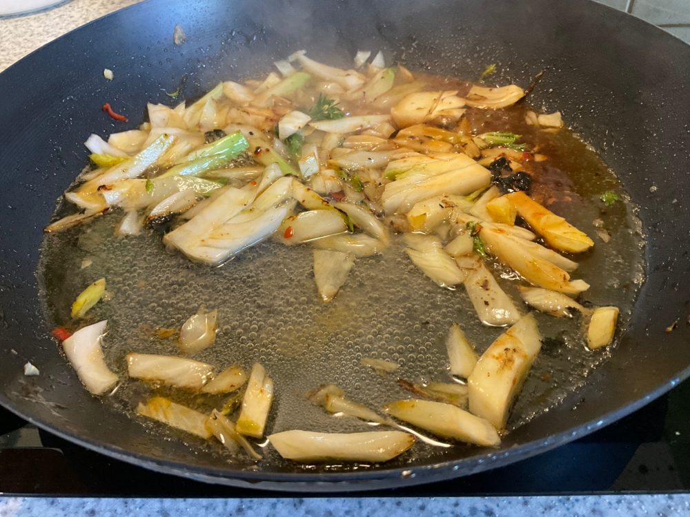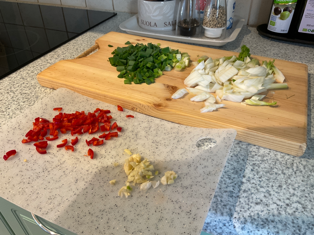 Pilko chili ja valkosipulinkynsi pieneksi. Poista puolikkaasta fenkolista kanta ja suikaloi. Silppua kevätsipulin varsia 4-5 kpl.