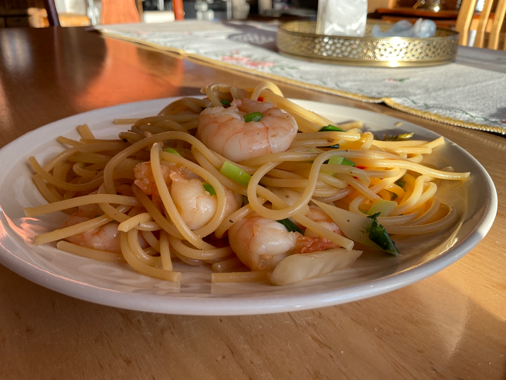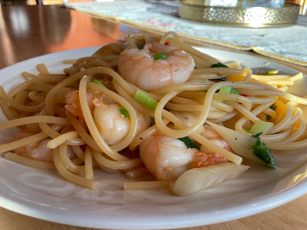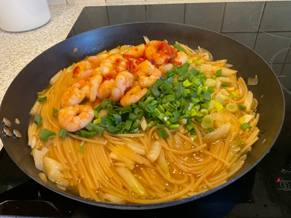 Lisää silputtu kevätsipuli ja jättikatkaravut. Keitä vielä 2 minuuttia.