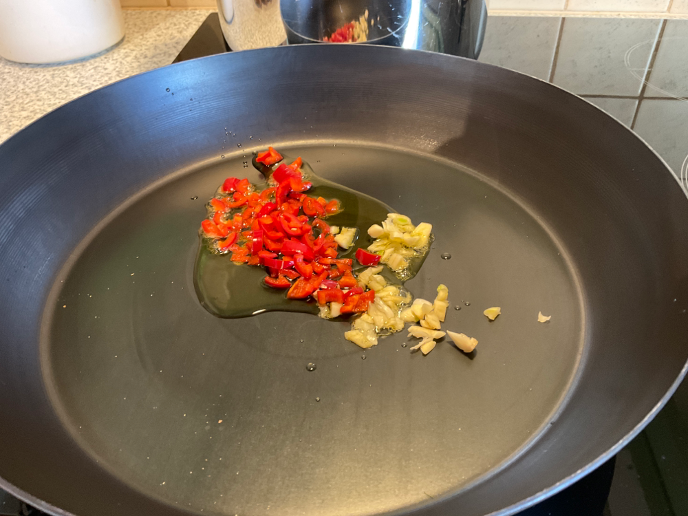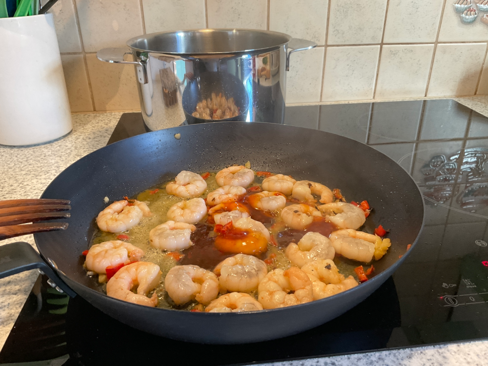 Kuullota chiliä ja valkosipulia hetki öljyssä. Lisää sulatetut ja valutetut jättikatkaravut pannulle. Paista muutama minuutti kuumalla lämmöllä. Lisää 3 rkl chilikastiketta ja sekoita. Ota paistos