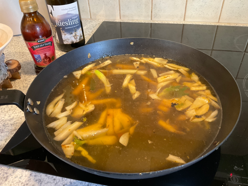 Lisää pannulle siivutettu fenkoli ja paista hetki. Lisää 2 dl valkoviiniä ja kiehauta. Lisää sitten hummerifondista tehtyä lientä 8 dl.