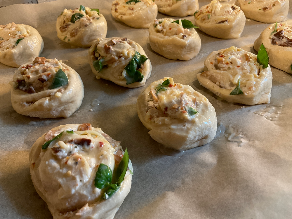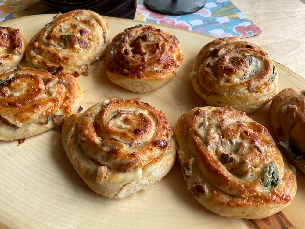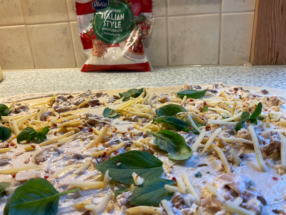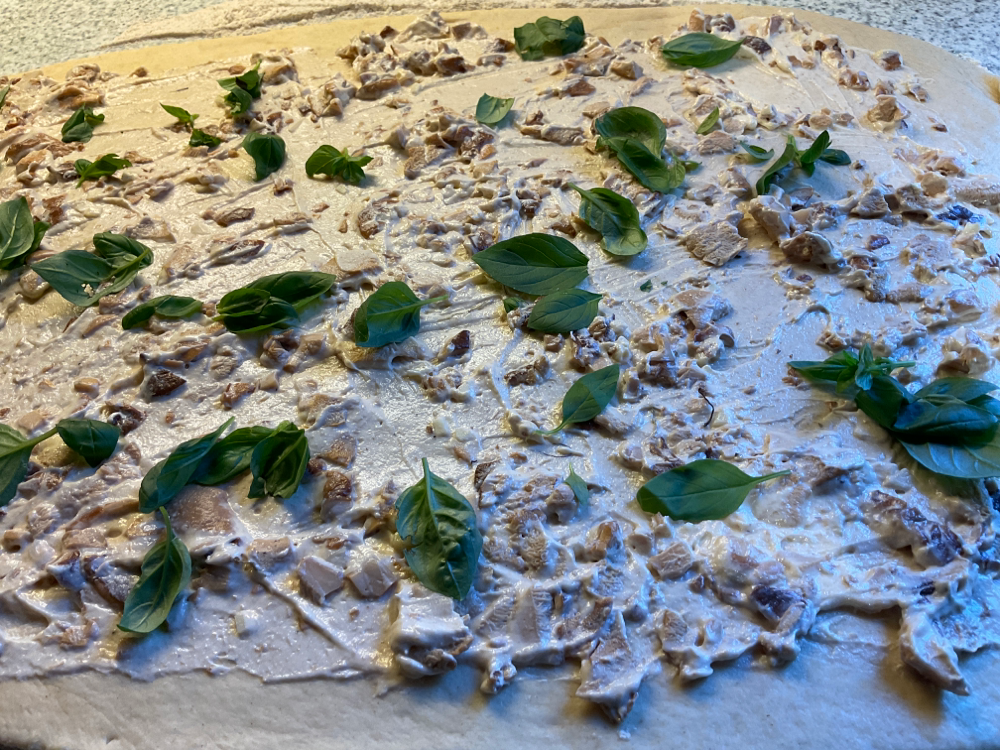 Kaulitse tainasta 2 levyä 25x45 cm. Levitä päälle sienituorejuustoseos, tuoreita basilikan lehtiä ja juustoraastetta.