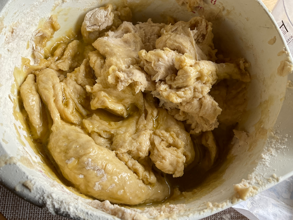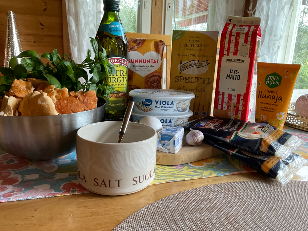 Lisää 3 dl spelttijauhoja ja vähitellen n. 9 dl vehnäjauhoja. Lisää 1 dl öljyä ja alusta taikina kimmoisaksi.