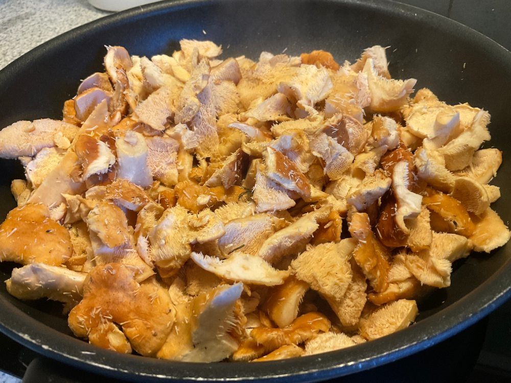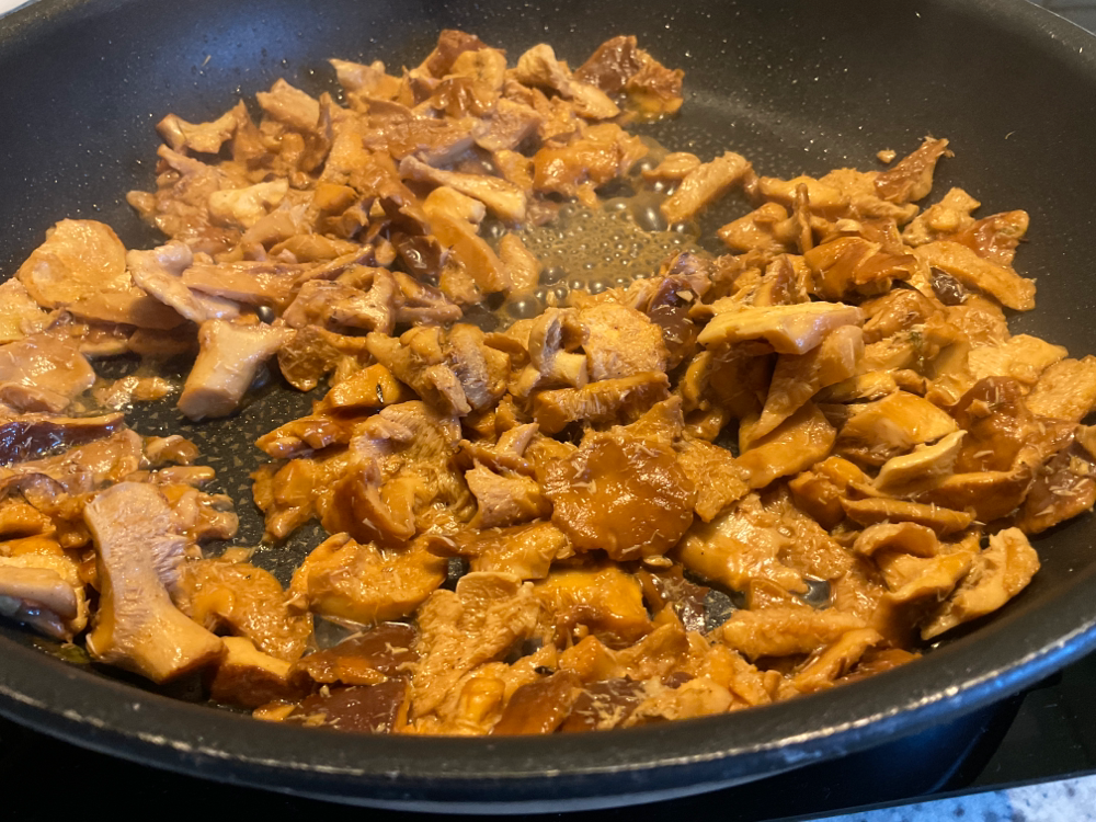 Paista pannulla n. 2 l puhdistettuja sieniä öljyssä, niin että vesi haihtuu ja mausta suolalla. Itse käytin tässä vaaleita ja ruosko-orakkaita.