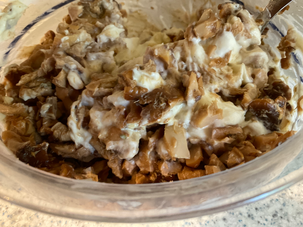 Hienonna sienet paistamisen jälkeen leikkuulaudalla ja sekoita tuorejuuston joukkoon.