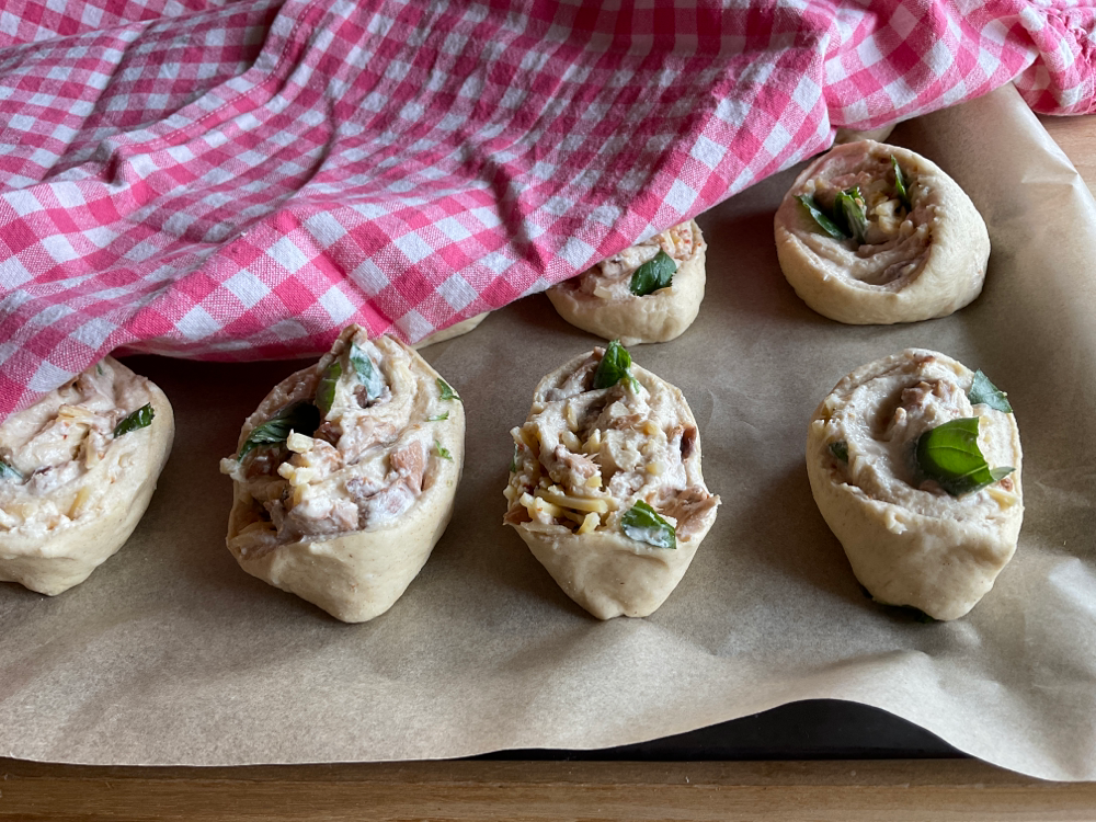 Asettele pellille, anna kohota liinan alla vielä n. 1/2 tuntia ja voitele kananmunalla.