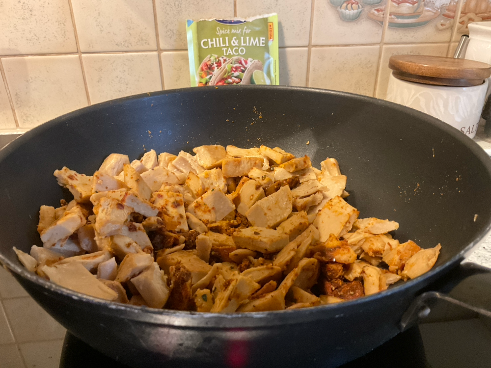 Paista soijaporoteenipalat (700 g) pannulla ja lisää joukkoon chili 🌶️ & lime taco maustepussi 28 g.