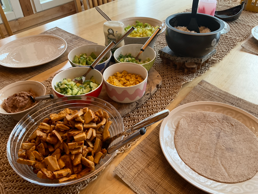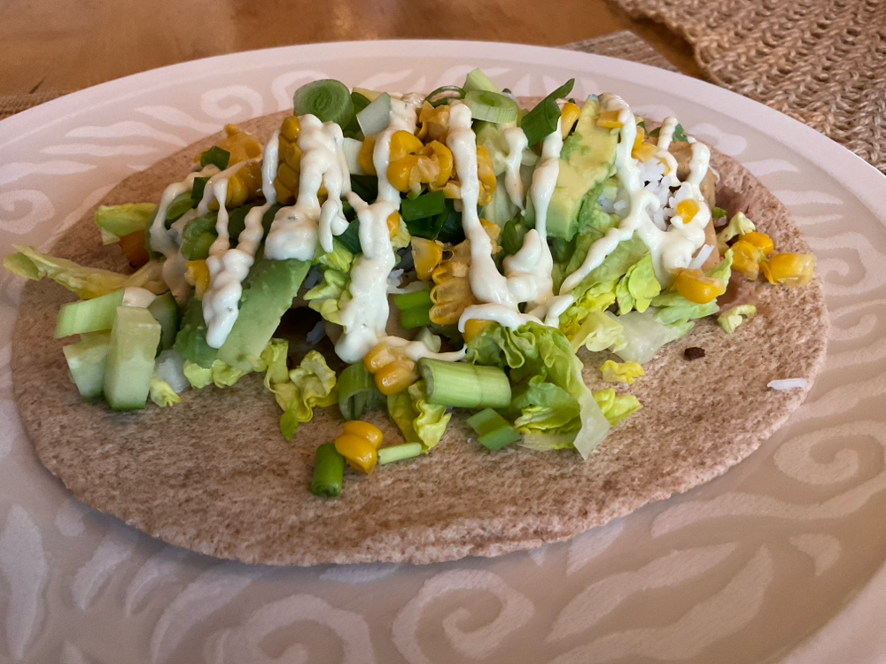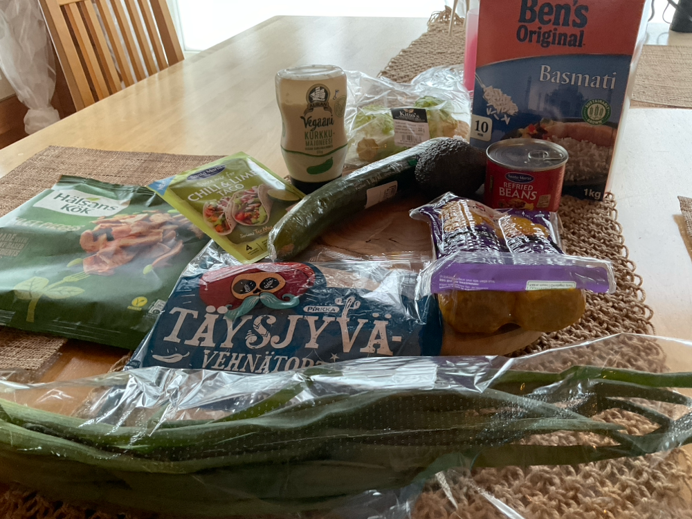 Lämmitä mikrossa tortillalettu. Levitä paputahnaa keskelle tortillaa, kasaa päälle salaatti, avokado, kevätsipuli, soijaproteiinipalat, kurkku, maissi. Mausta esim. kurkkumajoneesilla.
