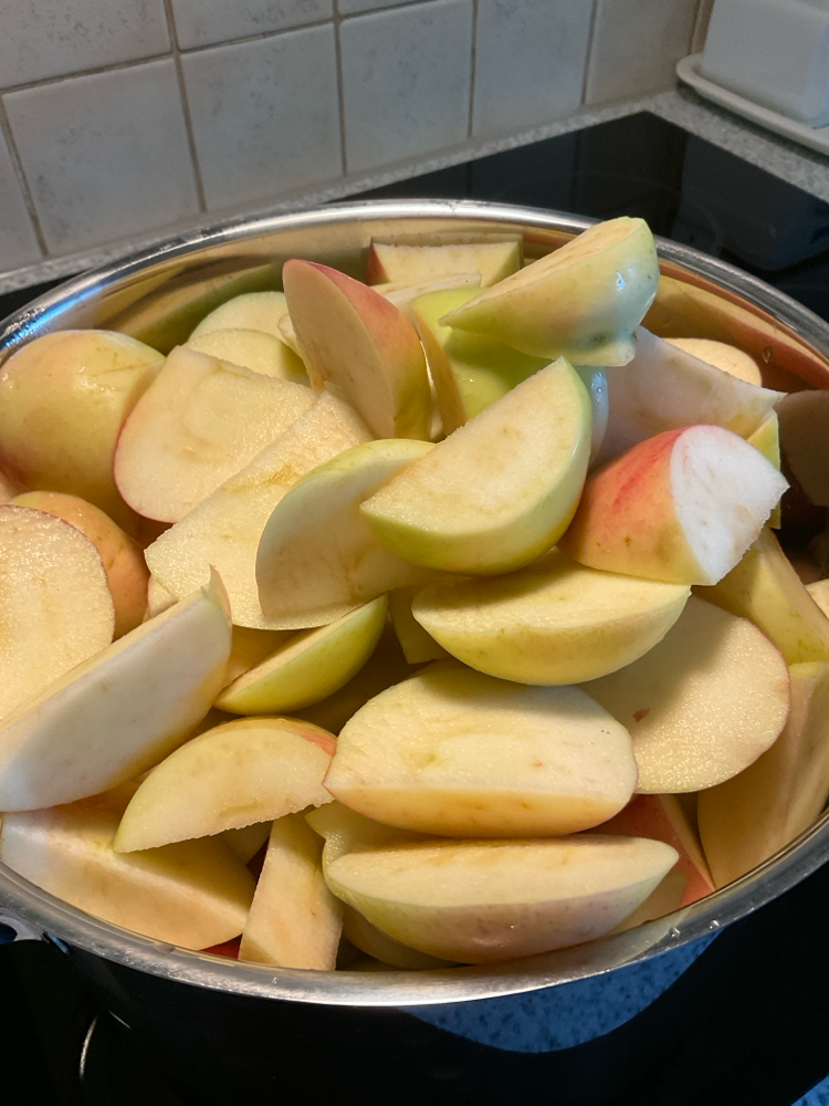 Lisää paksupohjaiseen kattilaan 1-2 dl vettä ja laita omenalohkot kattilaan. Keitä omenalohkoja niin kauan että ne pehvenevät.