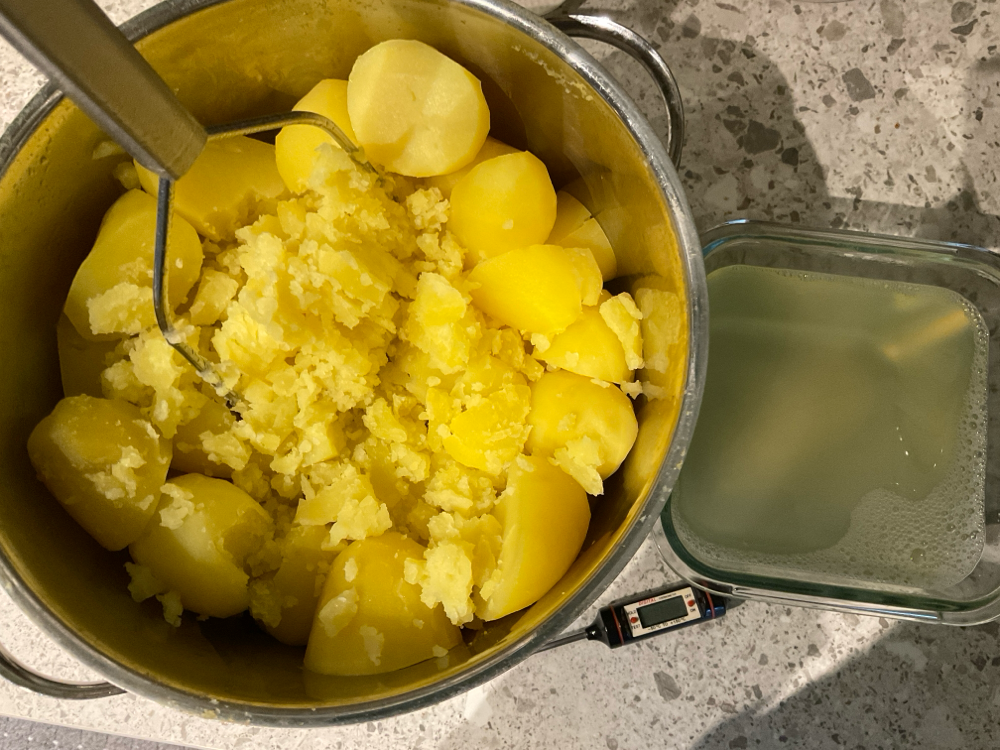 Anna perunasoseen jäähtyä hieman kättä lämpöisemmäksi ja ohenna 2-3 dl lämmintä keitinvettä. Perunamassan tulee olla 55-70 asteista, muuten se ei imelly.