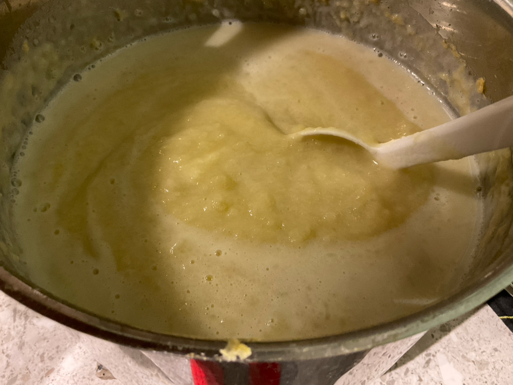 Lisää imeltyneen perunasoseen joukkook n. 5 dl maitoa. Seoksesta pitää tulla löysähkö puuromainen seos. Mausta suolalla ja halutessasi 1 rkl siirappia.