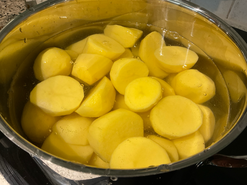 Kuori ja keitä suolattomassa vedessä 2,5 kg hyvin soseutuvan lajikkeen perunoita.