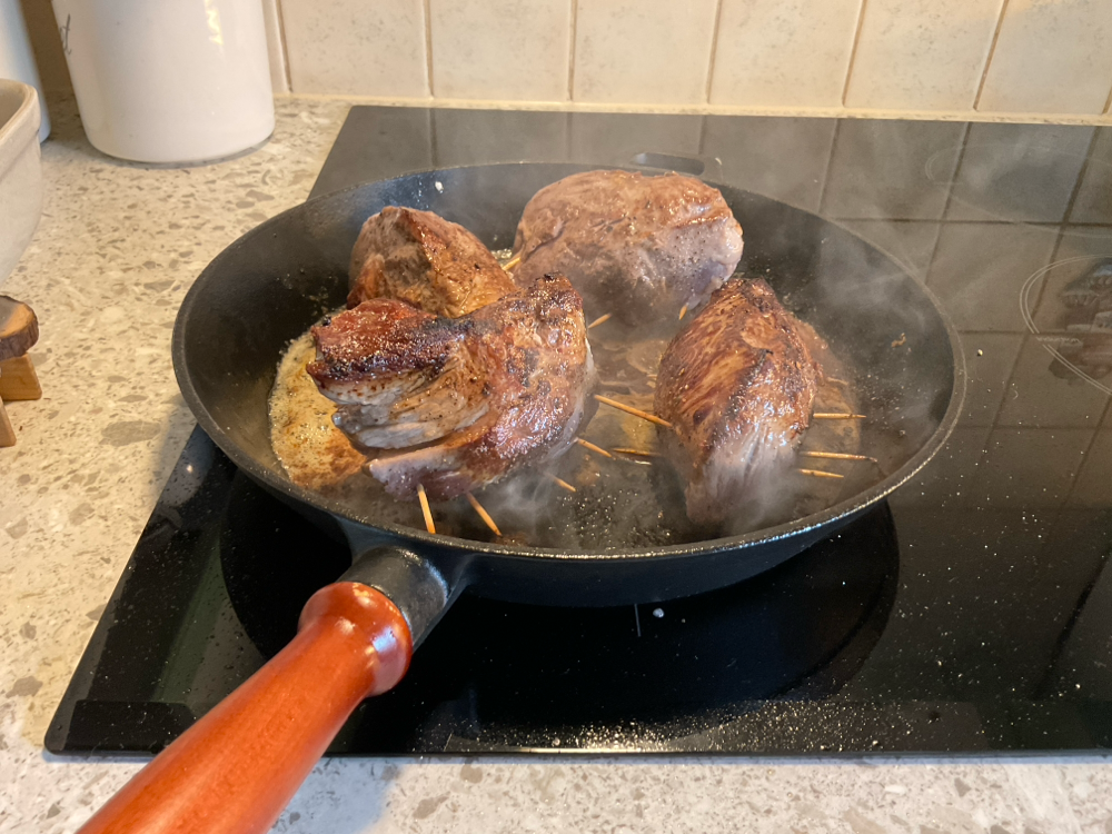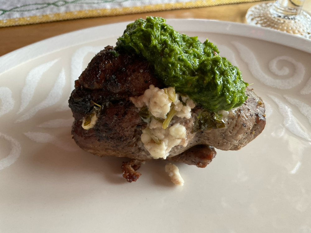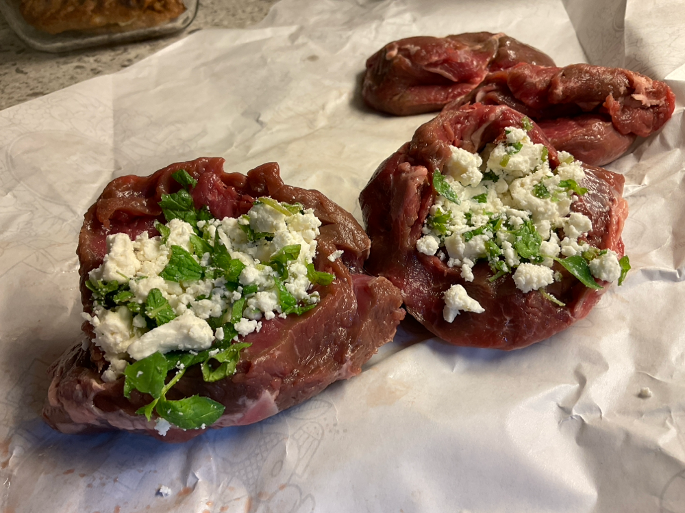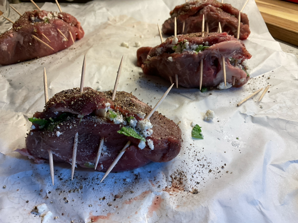 Leikkaa paistin sivuun terävällä veitsellä tasku, jonka täytät seoksella ja sulje coctailtikuilla. Mausta suolalla ja pippurilla.