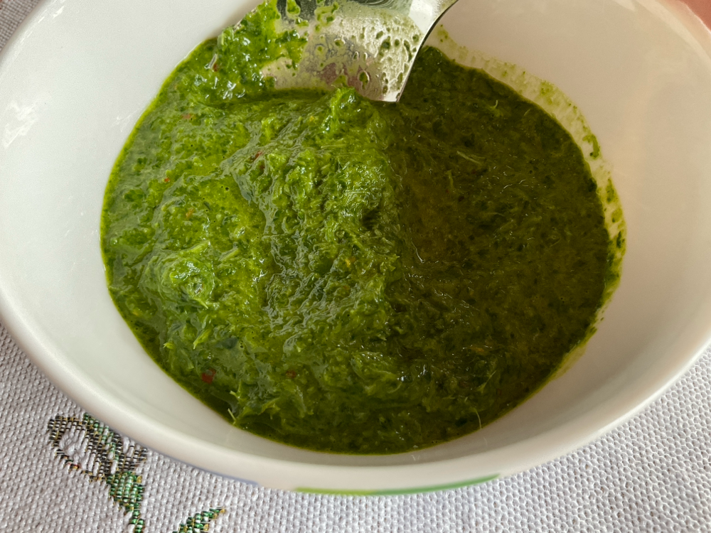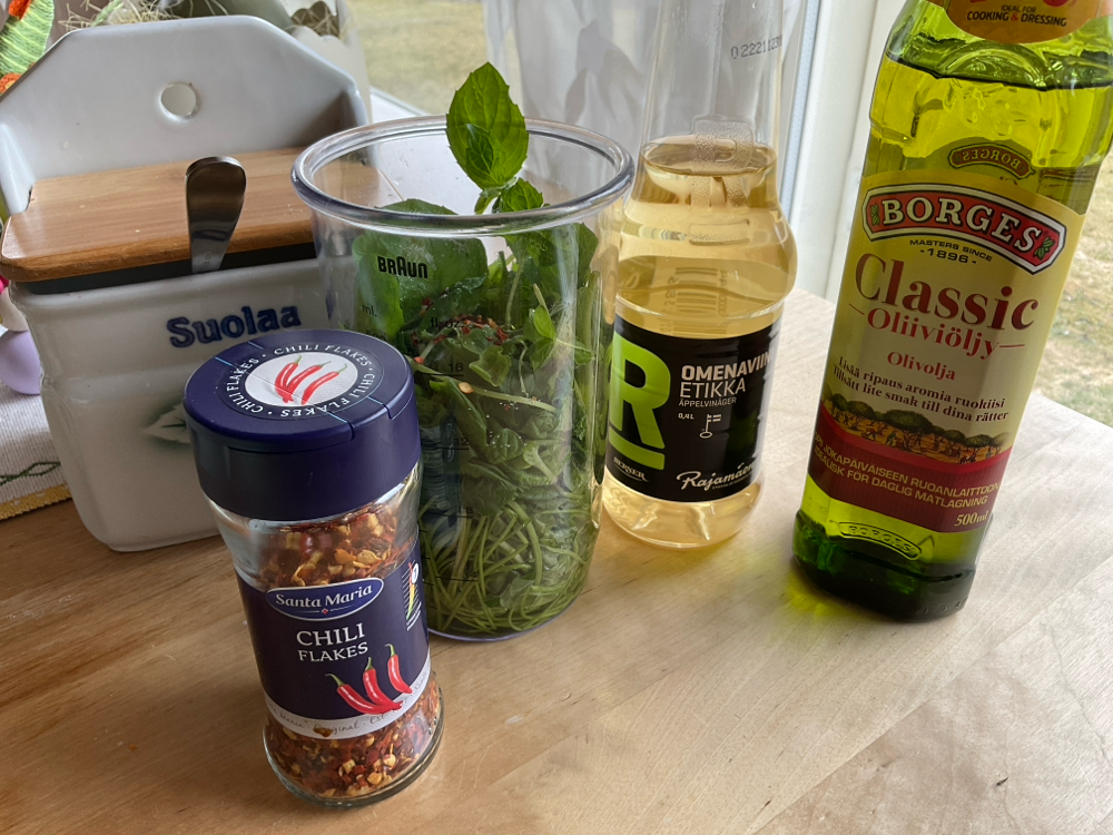 Tee minttuchimichurri. Soseuta astiassa 1,5 ruukkua tuoretta minttua, 1 ruukku tuoretta lehtipersiljaa, ripaus chililastuja tai 1/2 mietoa tuoretta chiliä sekä 1,5 rkl omenaviinietikkaa, 3/4 dl