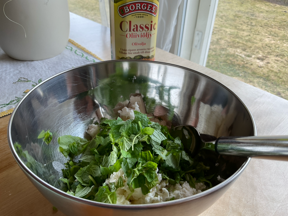 Murenna n. 150 g fetaa kulhoon ja sekoita sen joukkoon 1/2 ruukkua tuoretta minttua ja 1 tl oliiviöljyä.