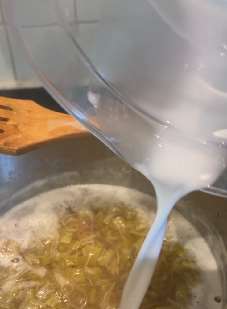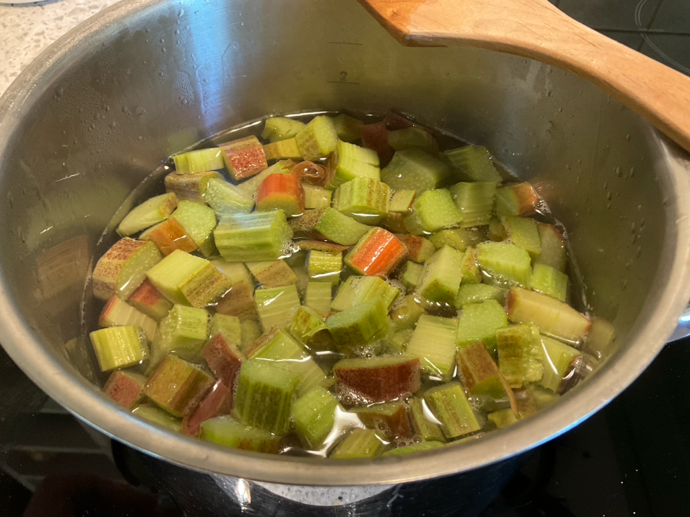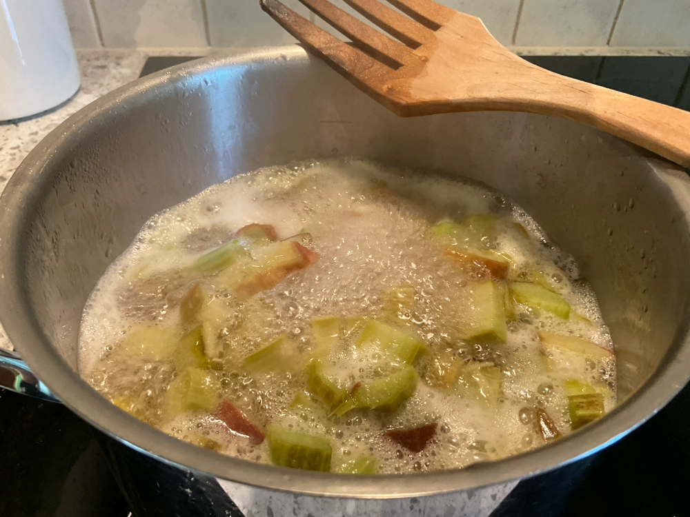 Lisää joukkoon n. 500 g pilkottuja raparpereja. Keitä pehmeäksi.