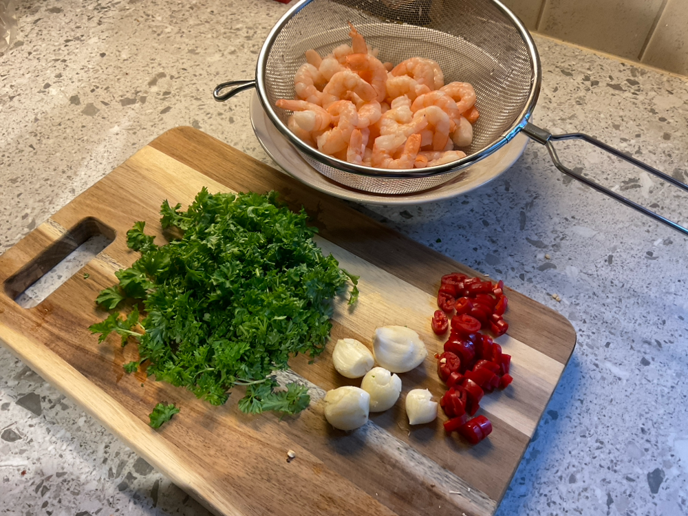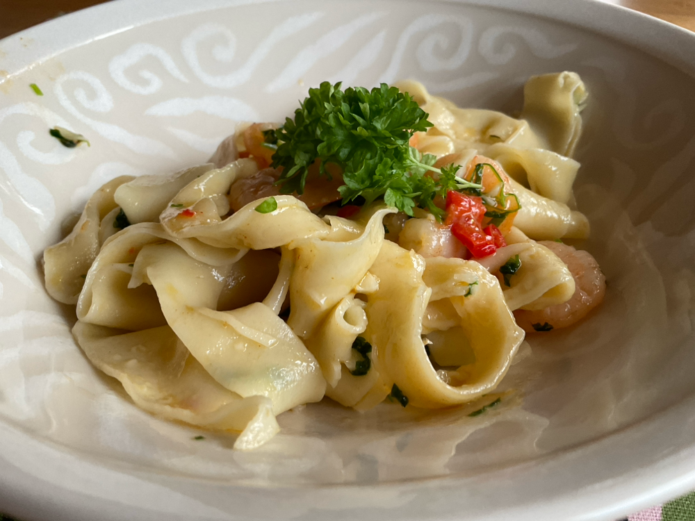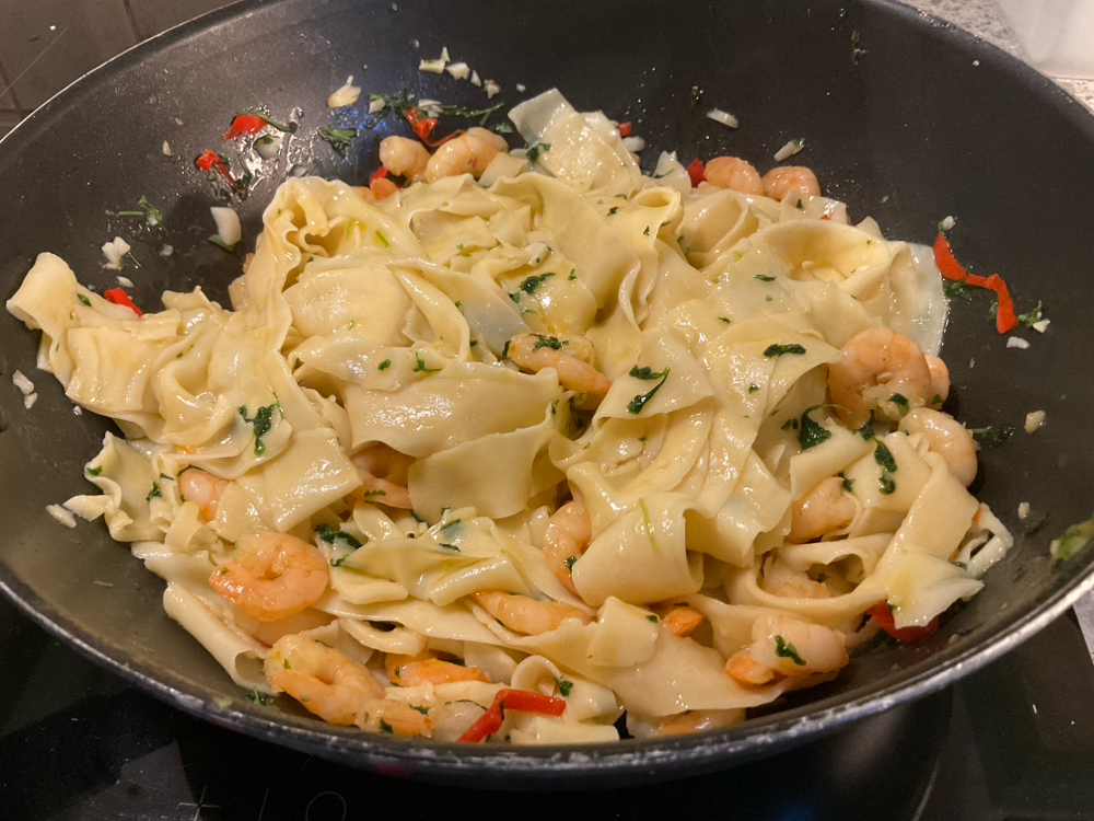 Lisää 2 dl silputtua persiljaa, sekoita ja lisää keitetty tuorepasta katkarapukastikkeen joukkoon.