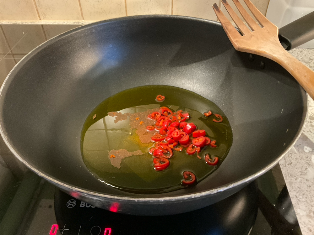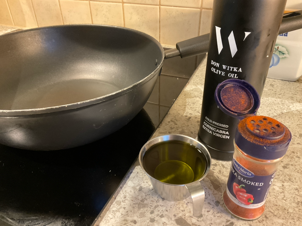 Kaada pannulle 1 dl öljyä. Kuumenna öljy ja lisää siihen 1 tl savupaprikajauhetta ja 1 pilkottu chili. Sekoita hetki.