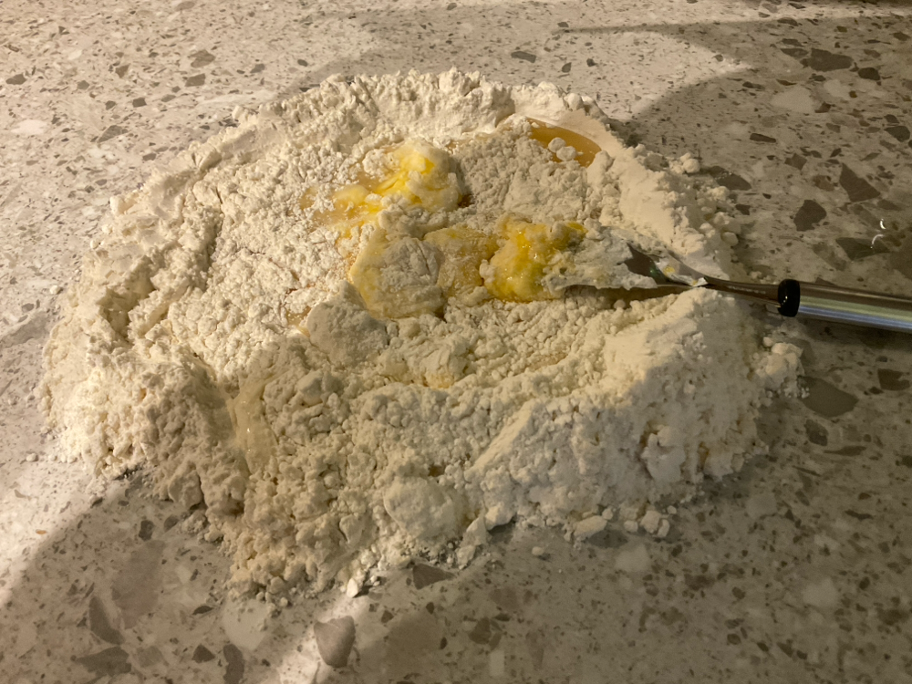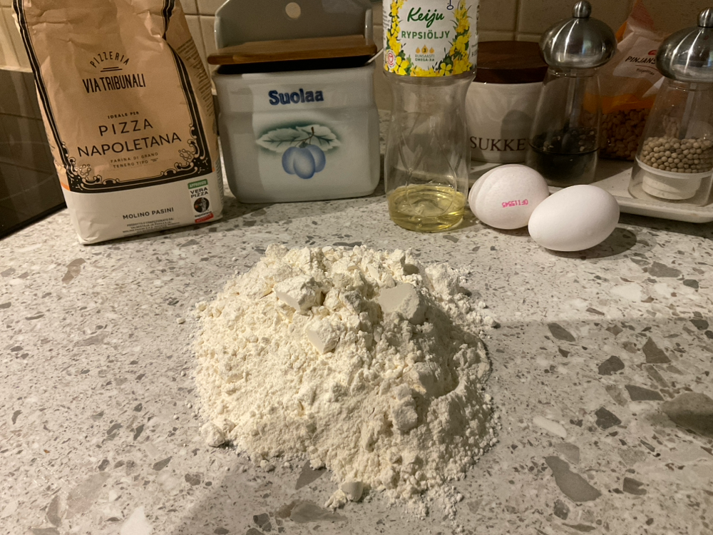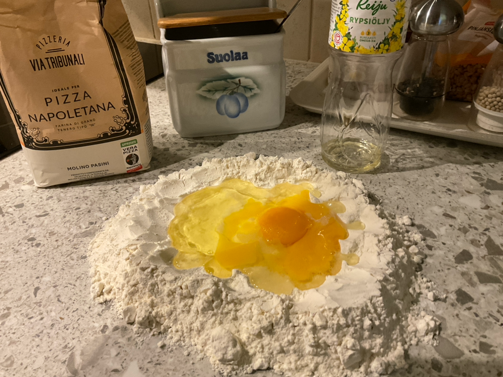 Levitä pöydälle 300 g 0-jauhoja. Tee jauhokeon keskelle pieni kolo, johon rikot 2 kananmunaa ja 1 tl suolaa. Sekoita haarukalla pikkuhiljaa seosta keskeltä alkaen.
