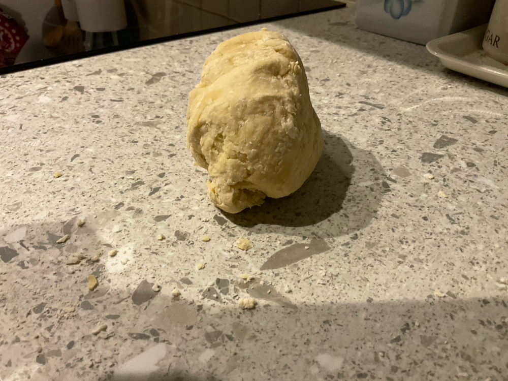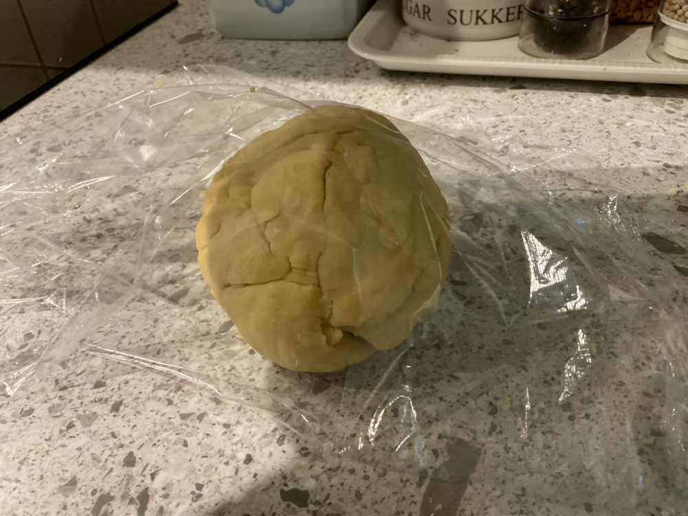 Vaivaa taikinaa käsin n. 10 minuuttia ja lisää taikinaan hieman vettä, jos näyttää siltä että seos on liian kuivaa. Siirrä taikinapallo kelmussa jääkaappiin puoleksi tunniksi.