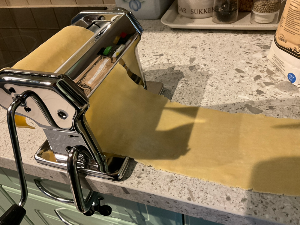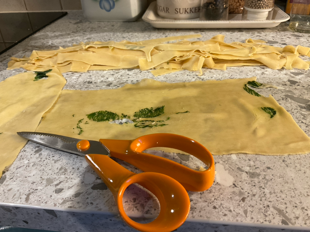 Käytin pastakonetta ja saksia taikinan muokkaamisesta pastanauhaksi.