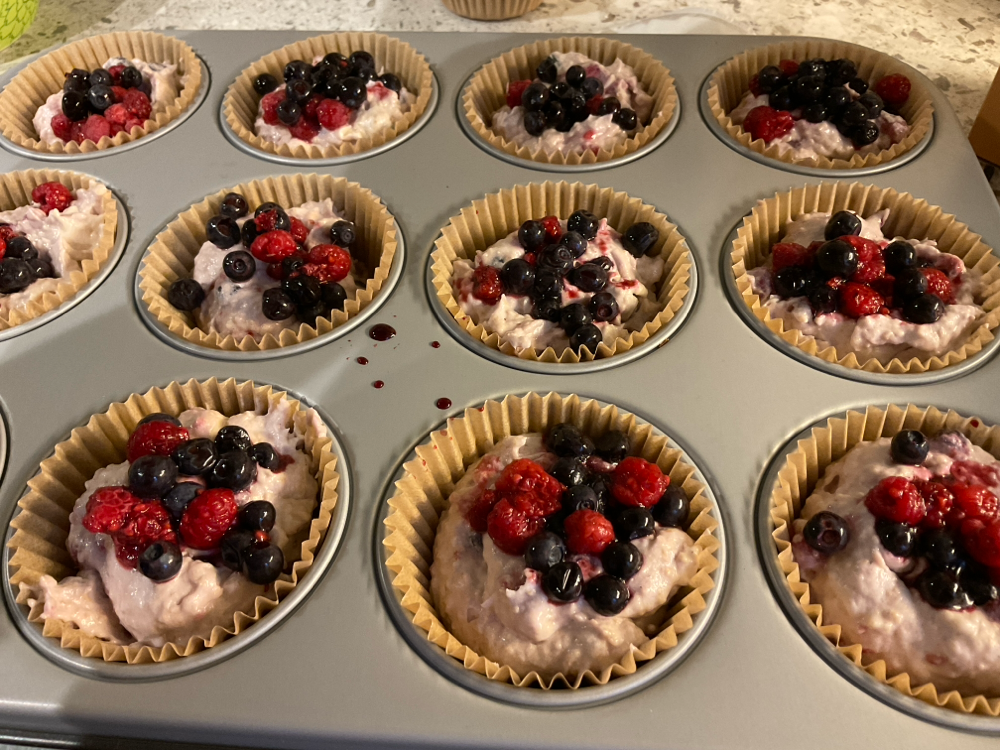 Jaa taikina muffinivuokiin ja koristele pinta marjoilla ja paista 200 asteisessa uunissa n. 20 minuuttia.