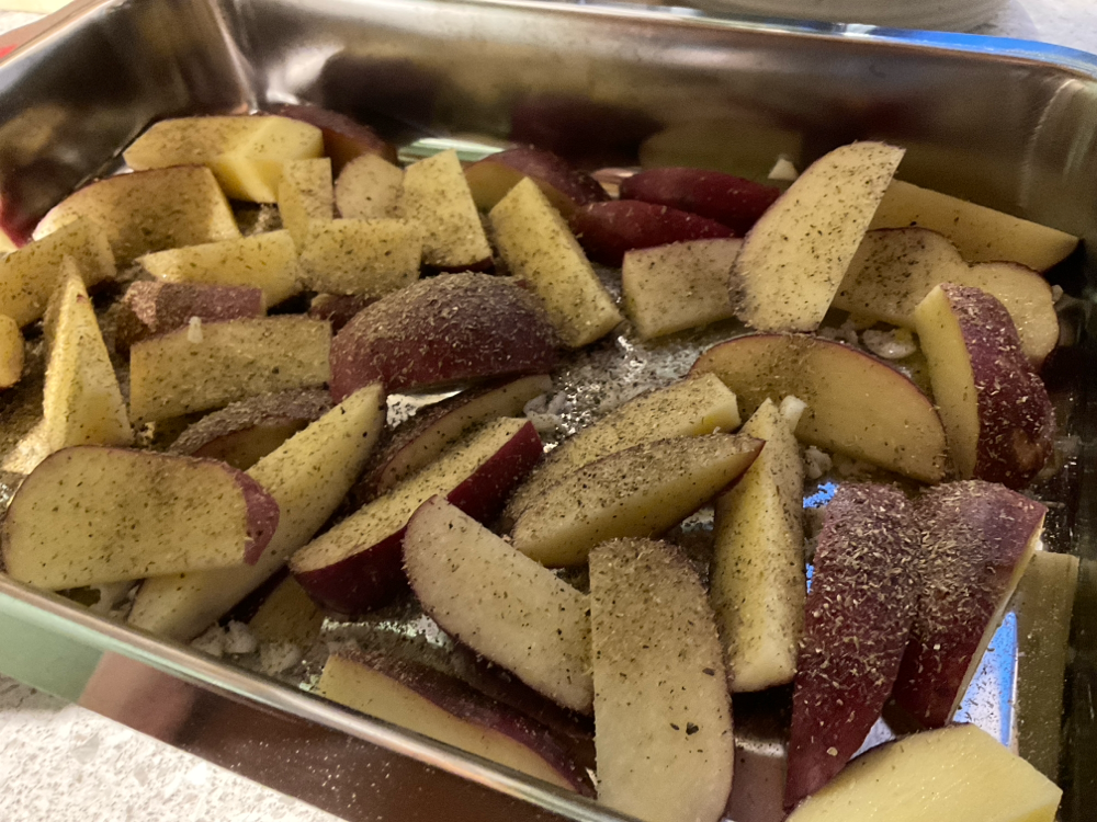 Ripottele päälle suolaa, mustapippuria myllystä ja kuivattua oreganoa. Sekoita mausteet perunalohkoihin hyvin.