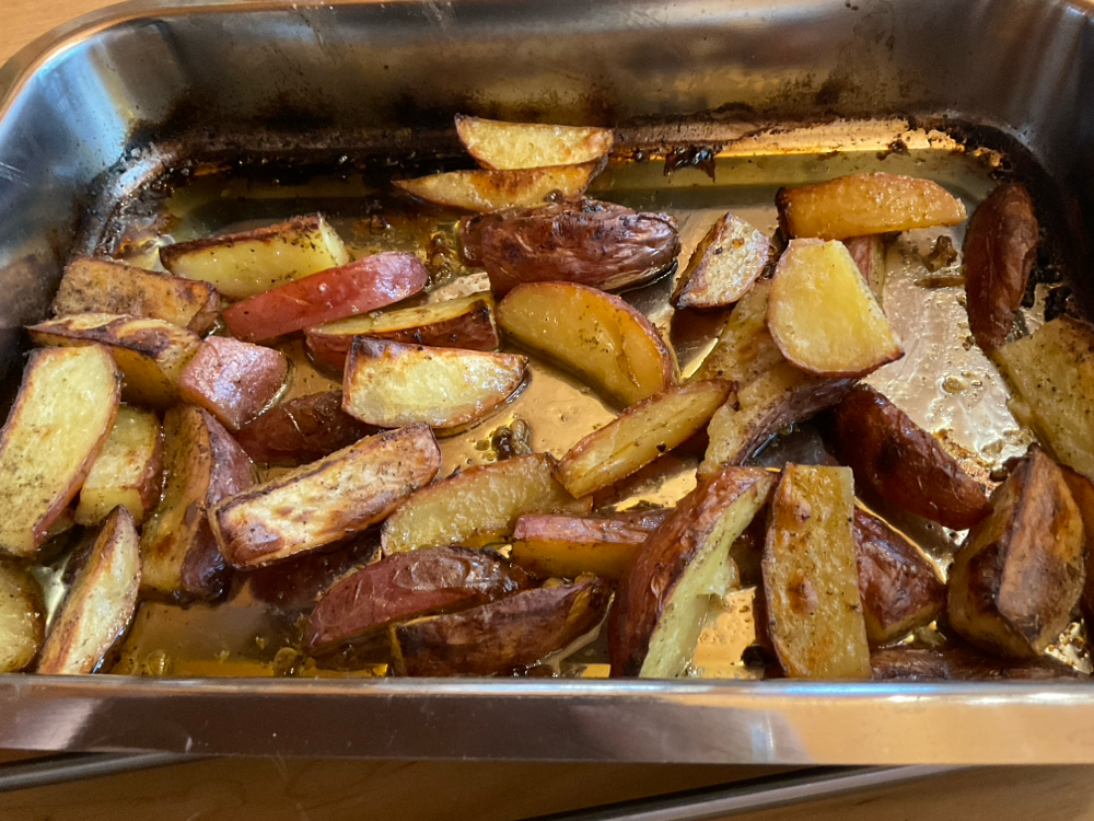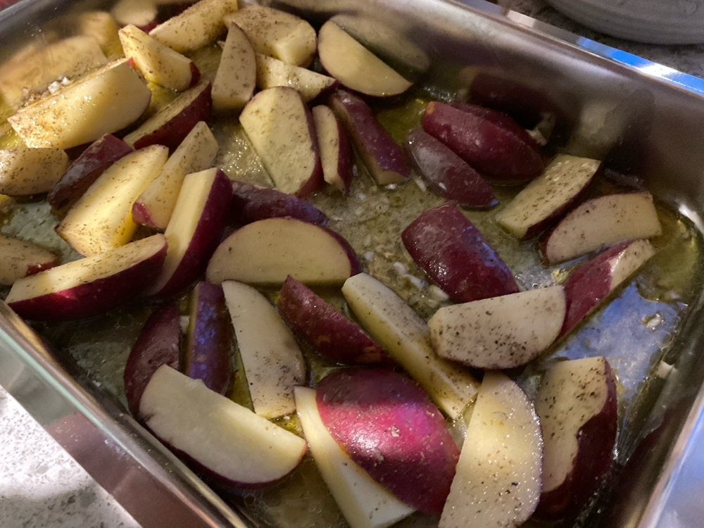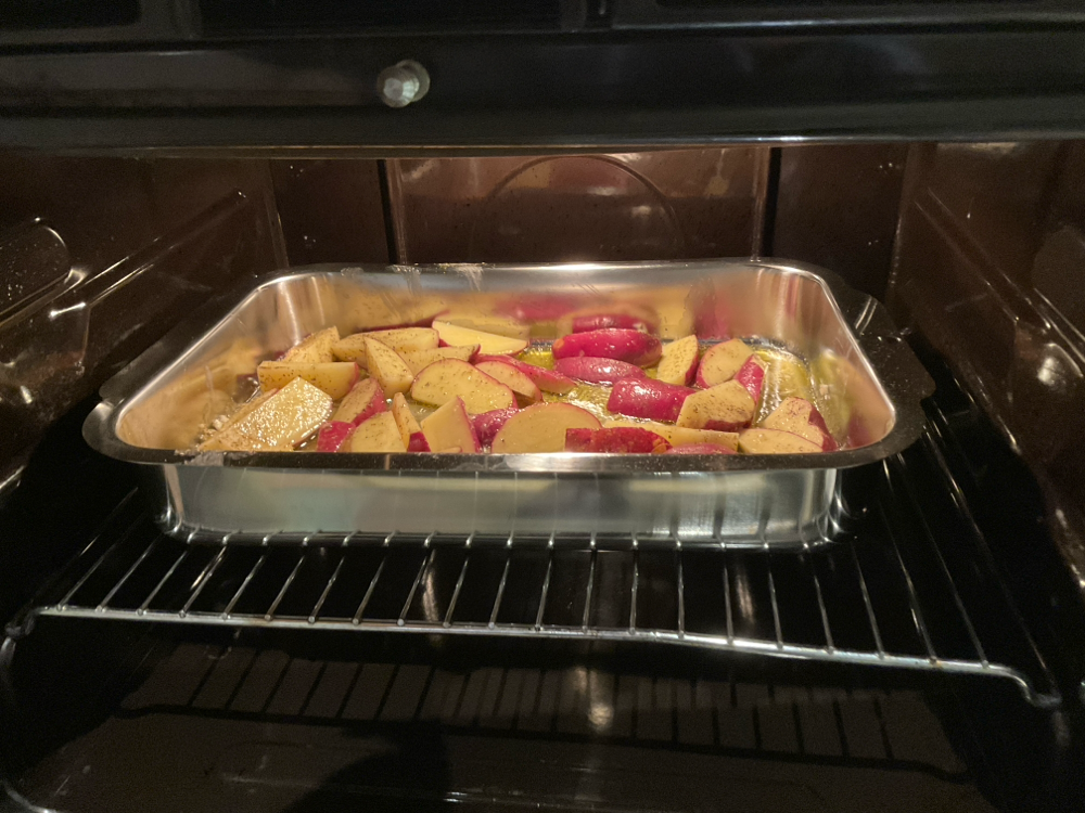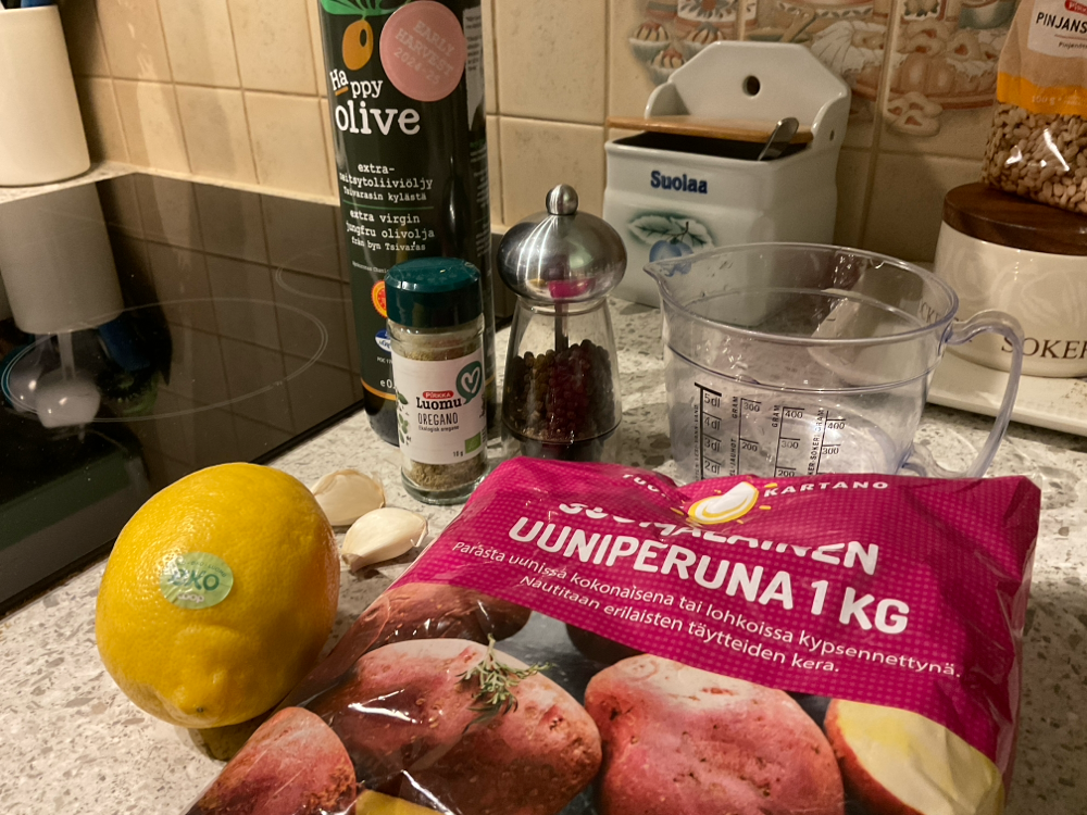 Paista perunoita 40 min. 200 asteisessa uunissa. Ota vuoka uunista ja käännä perunoiden paistopinta ja paista uunissa vielä toiset 40 min.