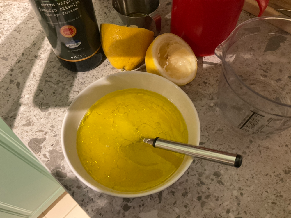 Sekoita keskenään 1 dl oliiviöljyä, 1 dl vettä ja 1 sitruunan mehu.