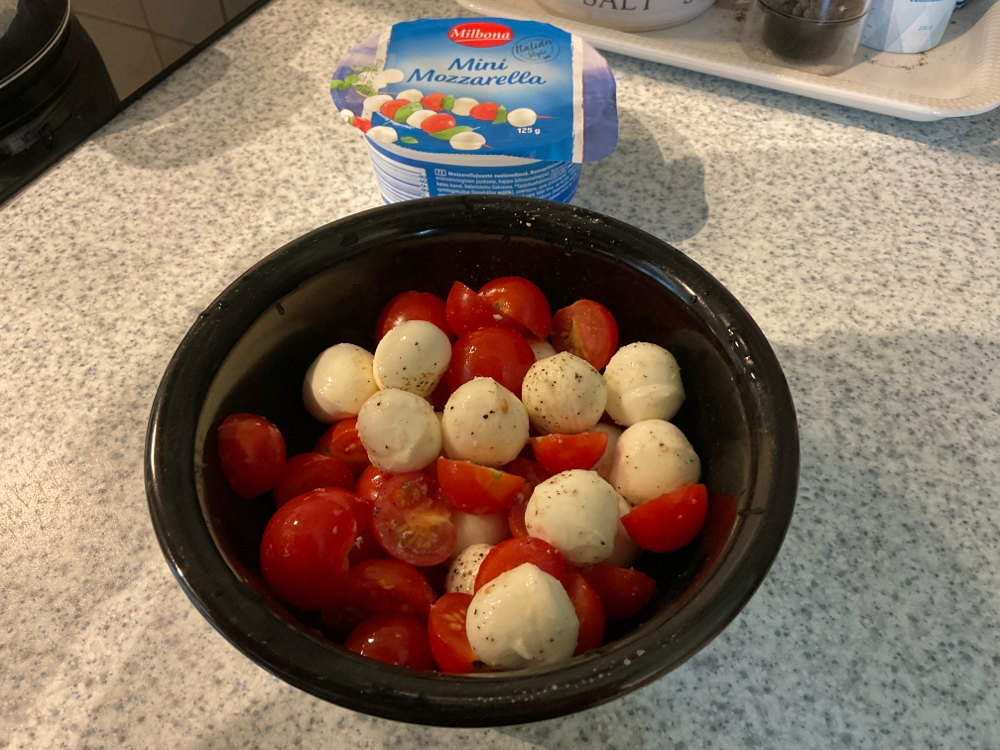 Rasia pikkutomaatteja halkaistuna ja rasia mini mozzarellaa sekoitetaan keskenään astiassa. Lisää joukkoon ripaus suolaa ja mustapippuria, anna maustua jääkaapissa 1 tunti. Halutessasi lisää tuoretta basilikaa.