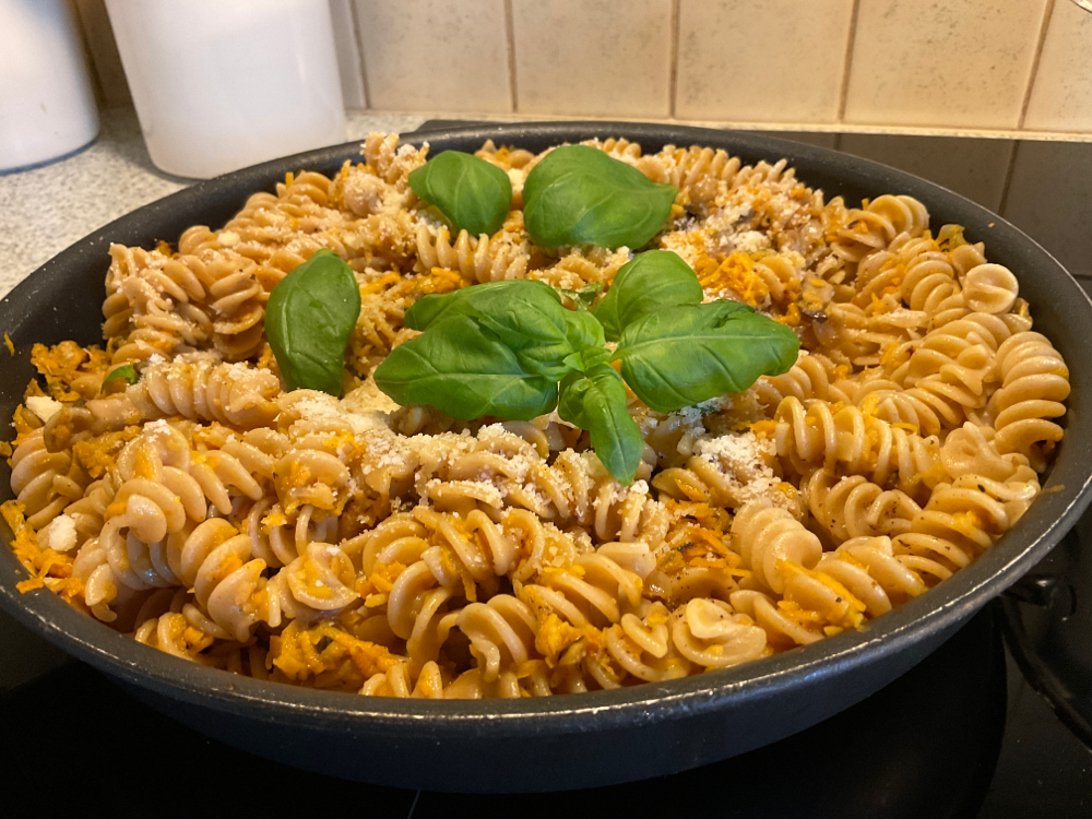 Keitä kokojyväpasta 400 g suolalla maustetussa vedessä ohjeen mukaan. Kuori ja raasta 400 g bataattia raasteeksi. Hienonna 2 sipulia. Paista bataattia ja sipulia paistinpannulla öljyssä n. 10 minuuttia.