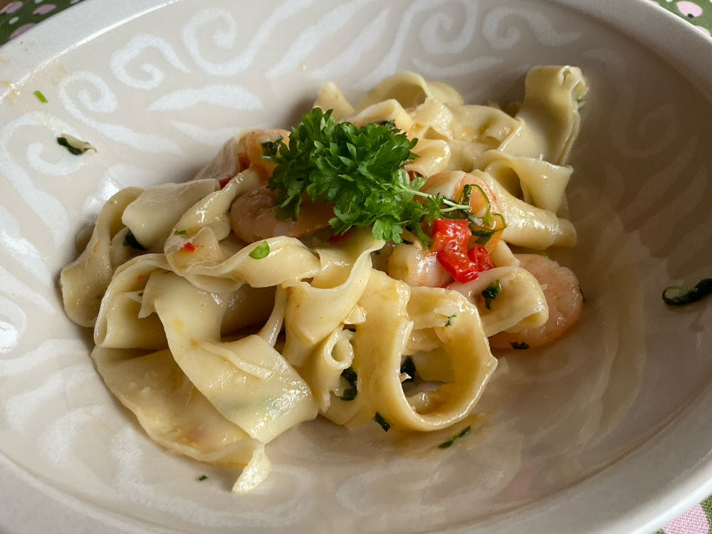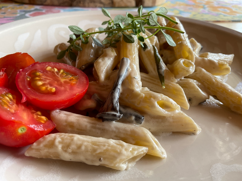 Keitä haluamaasi pastaa n. 500 g ohjeen mukaan. Kuullota 1 sipuli ja valkosipulinkynsi voissa rosmariinin oksan kanssa. Lisää sitten pannulle mustatorvisieniä n. 0,5 dl ja paista vielä hetki.