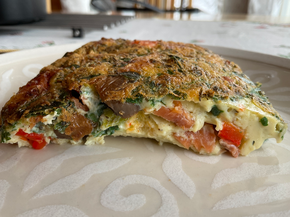 Pilko muutama kevätsipulinvarsi, 1 suippopaprika ja 5-6 herkkusientä pieniksi paloiksi. Viipaloi 100 g kylmäsavulohta valmiiksi. Sekoita keskenään kulhossa 6 kpl kananmunia, 1 dl kuohukermaa, 1 tl suolaa, 1 tl rouhittua mustapippuria, 1 tl meiramia, 1 tl provencale yrttiseosta ja reilu kourallinen pinaatinlehtiä.